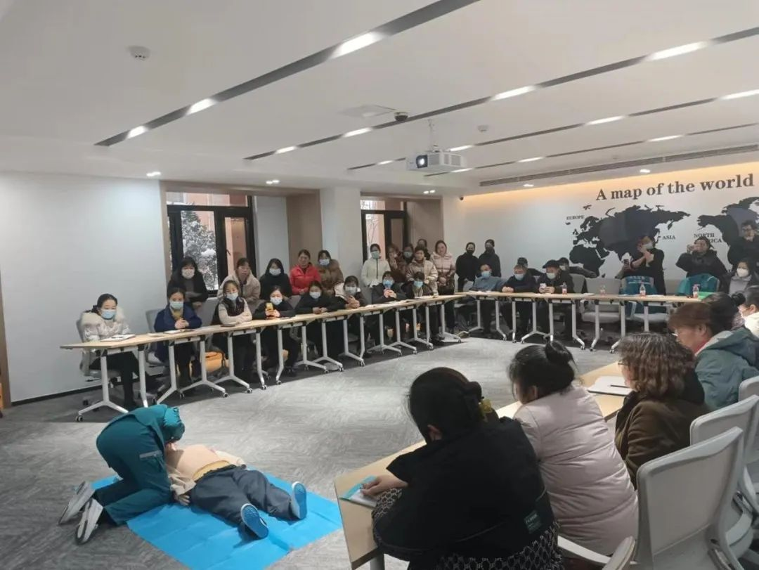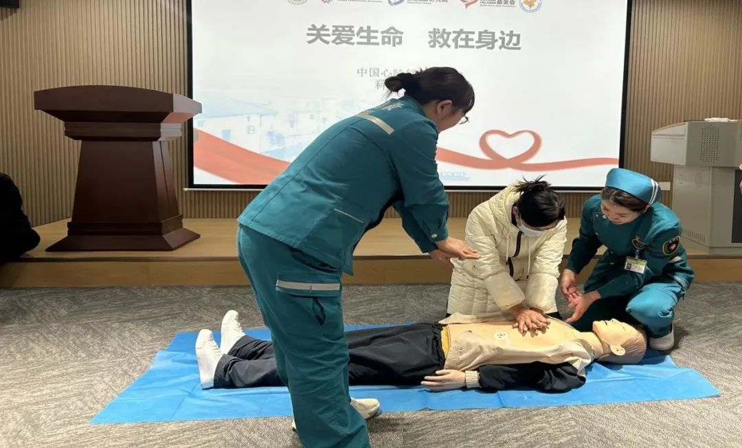 第二部分为急救技巧实操练习。为巩固所学理论知识,切身体验急救过程,在医护人员的示范和指导下,邀请宿管老师利用模拟人对心肺复苏各个环节的技术要领进行了同步实操演练,掌握心肺复苏基本技能。