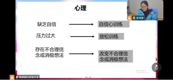 为引导和帮助考研学子缓解考前焦虑状态,坚定考研信心,积极冲刺迎考,心理健康教育中心于12月19日晚组织开展线上考研前心理辅导,此次活动由心理健康教育中心黄静静老师主讲,2024届部分考研学子参加。