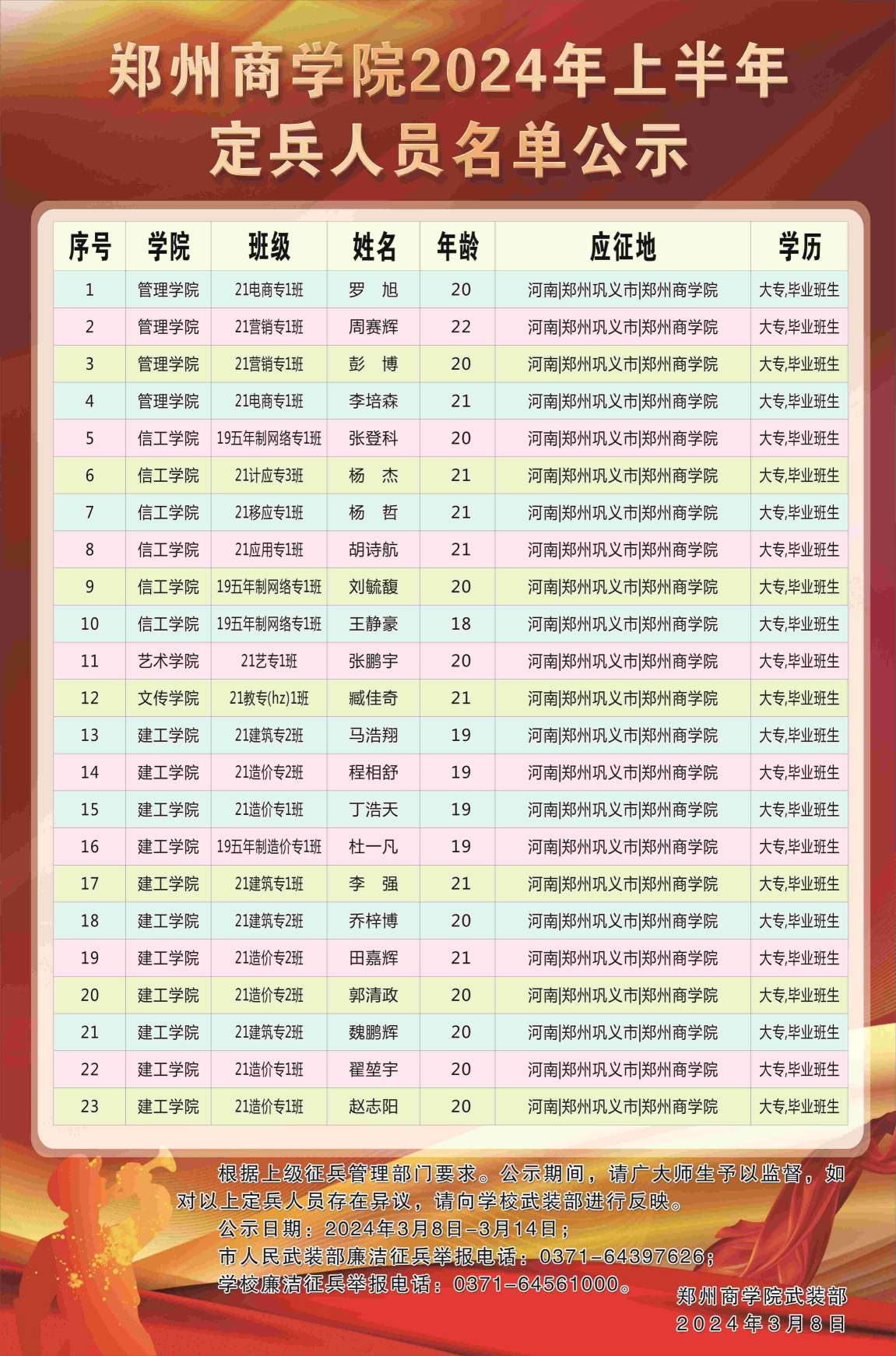 经过“网上报名、体格检查、心理测试、政治考核、役前教育”等环节,巩义市征兵工作领导小组定兵会议研究通过,确定我校罗旭等23名学生为2024年上半年应征入伍定兵对象,现根据相关规定予以公示,人员名单如下: