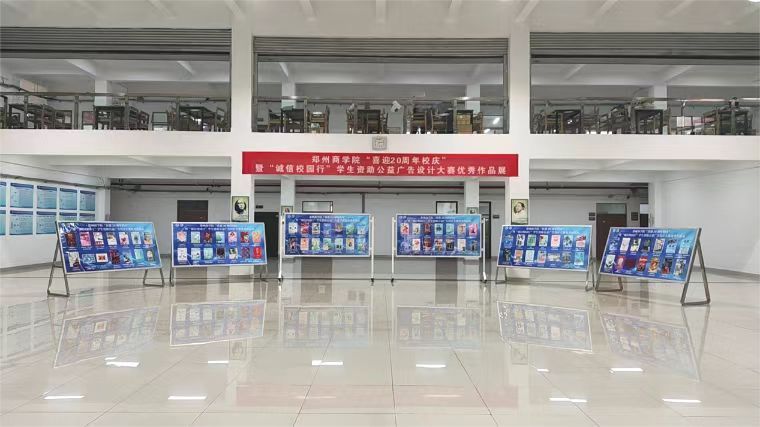 3月25日,学务处学生资助管理中心在自力楼一楼大厅进行“喜迎二十周年校庆”暨“诚信校园行”学生资助公益广告设计大赛优秀作品展。