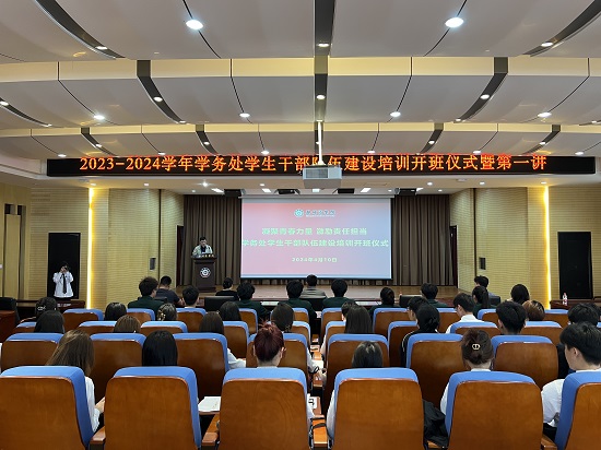 为进一步推进“立德树人工程”,牢固树立“以学生为中心”的发展理念,提升学务处学生干部的思想觉悟和政治素养,充分发挥学生干部各项职能作用,构建学生干部成长跟踪培养机制,逐步打造一支高素质队伍,4月10日下午,学务处学生干部队伍建设培训开班仪式暨第一讲于图书馆五楼报告厅举行,体育学院党委书记刘健、学务处各职能部门及所属主要学生干部参加本次开班仪式,会议由劳卫科科长贺萌主持。