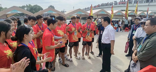 决赛开始前,巩义市委书记袁聚平一行看望慰问了参加决赛的我校龙舟队,并鼓励大家戒骄戒躁、再接再厉,超越自我,以更加优异的成绩向社会各界展示郑商学子的精神风貌。