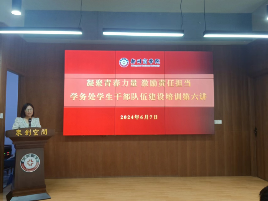 为进一步加强学生干部心理素质教育工作,提高学生干部心理抗压和调适能力,6月7日,学务处学生干部队伍建设培训第六讲于学生事务中心三楼路演厅举行,本期培训由心理健康教育中心黄静静老师主讲,学务处学生干部参加。