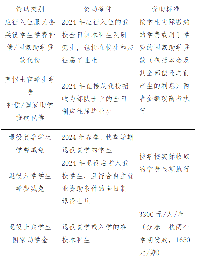 根据财政部、教育部等五部门印发的《学生资助资金管理办法》(财教〔2021〕310号)和河南省学生资助中心《关于报送2024年度服兵役高校学生国家教育资助等信息的通知》(豫教资〔2024〕32号)等文件要求,我校将开展2024年度服兵役学生国家教育资助申报工作,现将相关事宜通知如下: