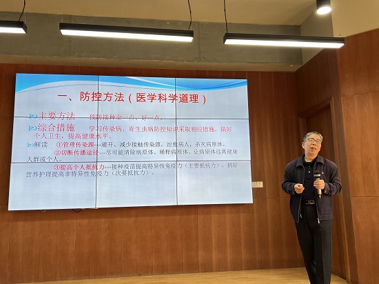 首先,秦科长以“校园传染病防控”为主题,对校园传染病发生的特点、危害、传播途径及原因分析进行了解读。秦科长用通俗易懂的语言结合典型案例,根据自己多年的经验给我校楼宿管员们科普了常见传染病的相关知识,传授防控方法、防控思路和预防接种知识,秦科长强调,在日常工作中要从预防出发,多角度、多方面地养成良好的生活习惯、卫生习惯,多开窗通风,合理膳食、适度运动、心理平衡,预防秋季常见传染病的发生。