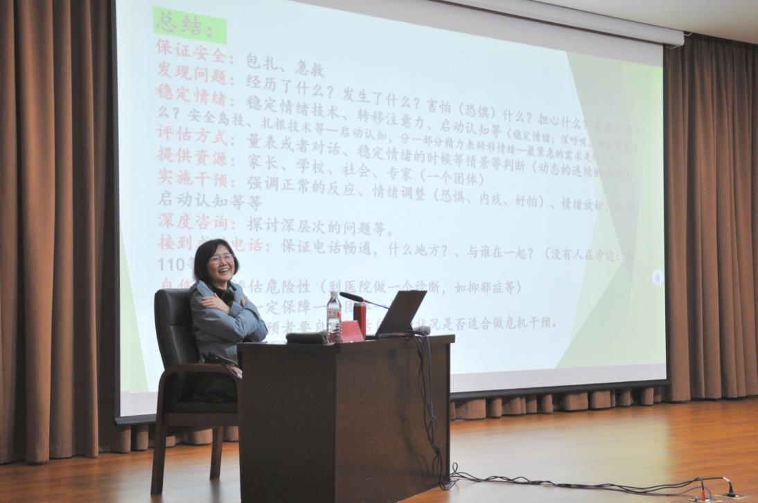 会议伊始,许慧教授就目前社会环境下心理危机症状产生的原因进行了阐述,接着通过压力测试小互动引入讲座的主题《大学生心理问题的识别与干预》。许慧教授分别从大学生常见心理问题、大学生危机预防和干预、学生工作者的自我关爱三个方面进行详细讲解,结合具体案例深入剖析心理危机干预的原则、过程和步骤。