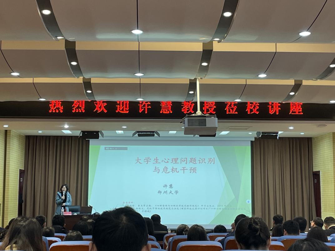 会议伊始,许慧教授就目前社会环境下心理危机症状产生的原因进行了阐述,接着通过压力测试小互动引入讲座的主题《大学生心理问题的识别与干预》。许慧教授分别从大学生常见心理问题、大学生危机预防和干预、学生工作者的自我关爱三个方面进行详细讲解,结合具体案例深入剖析心理危机干预的原则、过程和步骤。