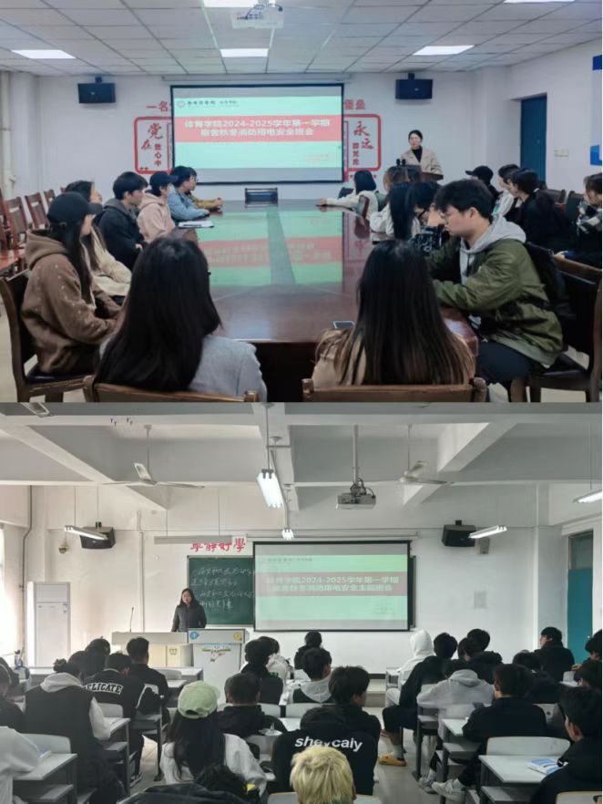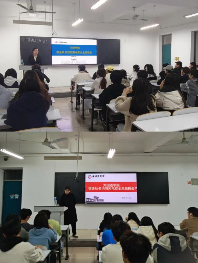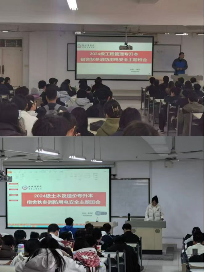 2024年11月9日是我国“第33个全国消防日”,为推进我校“六化一家园”建设,进一步提高同学们的消防安全责任意识,努力构建平安和谐宿舍,学务处宿管科组织各学院召开“宿舍秋冬消防用电安全”主题班会。