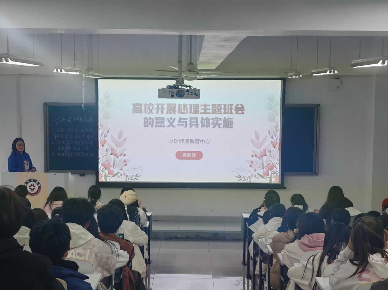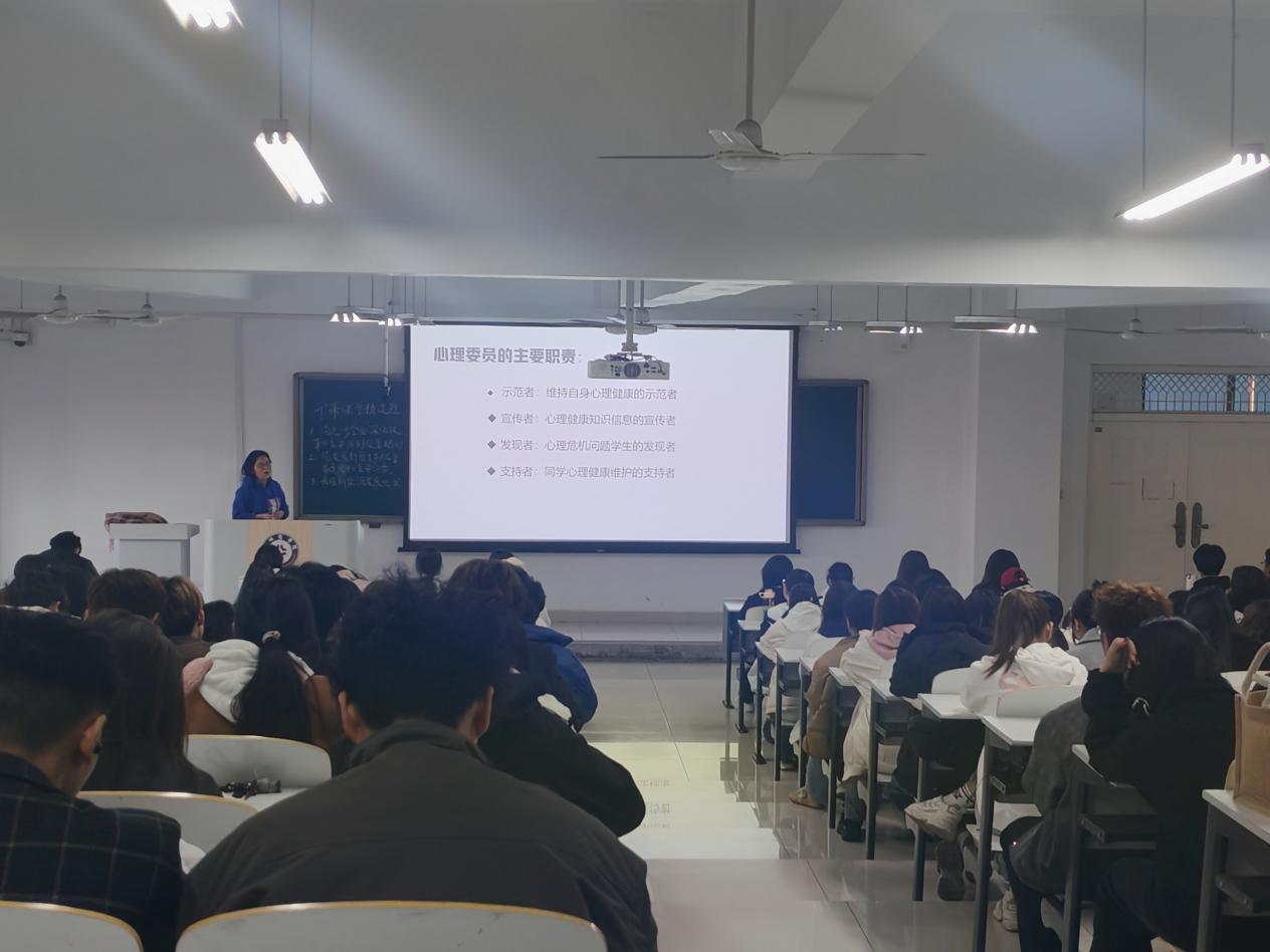 黄老师首先为大家讲述了心理委员的产生与发展,明确提出心理委员的主要职责。自心理委员制度在我校实施以来,越来越多的学生主动参与到心理健康服务工作中,积极发挥朋辈互助的优势,为同学们的心理健康保驾护航。而心理主题班会作为高校心理健康教育的重要组成部分,对于提升同学们的心理素质、增强心理调适能力具有重要意义,有利于充分发挥“学校-学院-班级-宿舍”四级工作机制。
