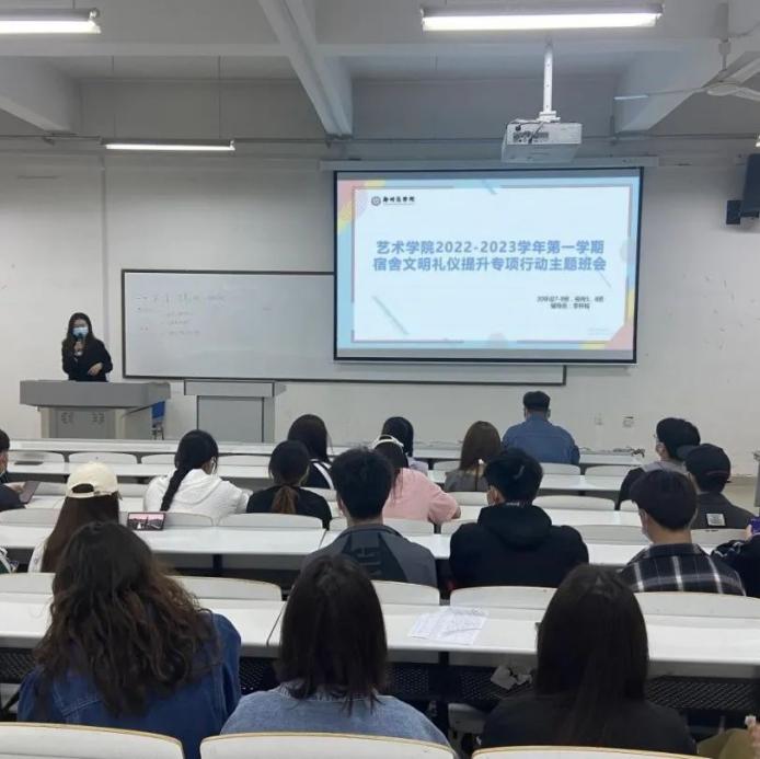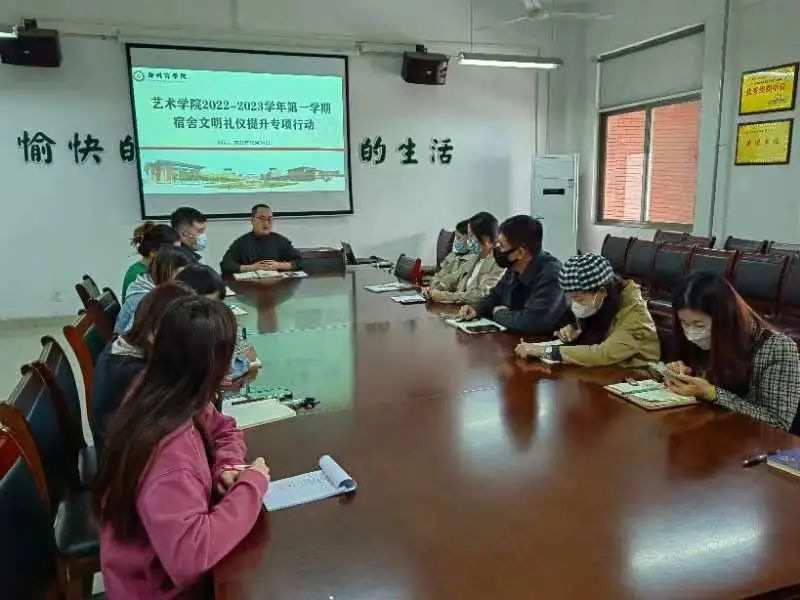 为做好学生日常管理工作,有序推进校园安全稳定和学生宿舍“六化一家园”建设,为同学们营造干净、舒适、安全的生活环境。艺术学院在第一次宿舍卫生专项行动基础上开展宿舍文明礼仪提升行动,10月24日上午10:30在艺术大楼会议室召开“宿舍文明礼仪提升专项行动工作”动员会,艺术学院全体师生参与本次会议。