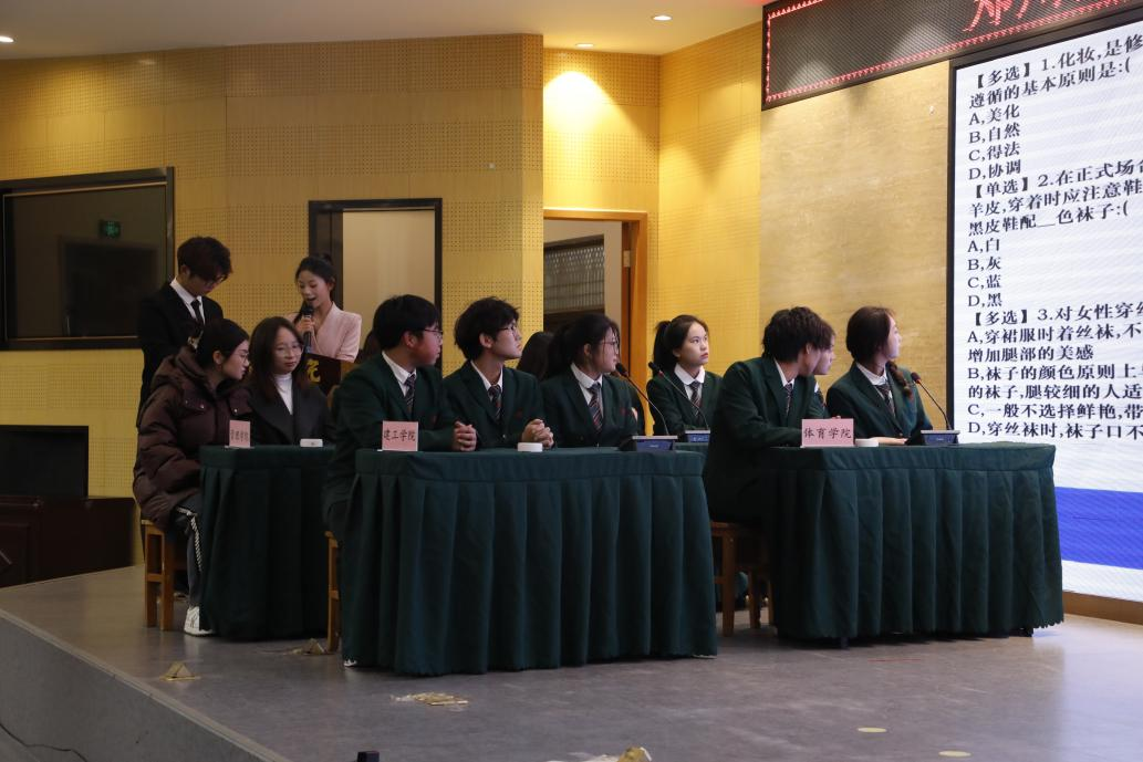 本次比赛,前期通过全校学生通过线上答题形式参与知识问答,最后选拔出由三名同学组成的学院代表队,进行礼仪知识竞赛。比赛伊始,由主持人宣读比赛规则及评分标准,本次赛制采取抽签的方式决定答题顺序,每学院派出三名代表上台作答,决赛分为三轮进行:有问必答,一站到底,争分夺秒。