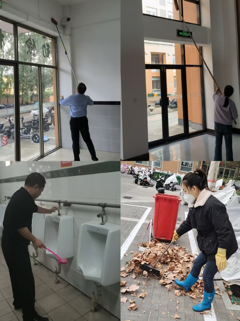 在卫生清扫过程中,宿管老师对公共区域进行了彻底清理,保证楼宇卫生无死角。此外,宿管老师还清理了楼宇周边的落叶和杂物,并对外围墙壁进行了冲刷,确保宿舍楼内外环境整洁有序。