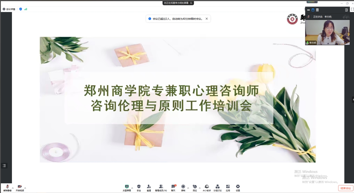 为进一步提升心理咨询服务质量,强化专兼职心理咨询师的职业道德与专业素养,规范学校心理咨询流程,3月20日下午,心理健康教育中心采用线上的形式组织召开了专兼职心理咨询师咨询伦理与原则工作培训会。此次会议由心理健康教育中心科长刘思楠主持,全体校内外专兼职心理咨询师参会。