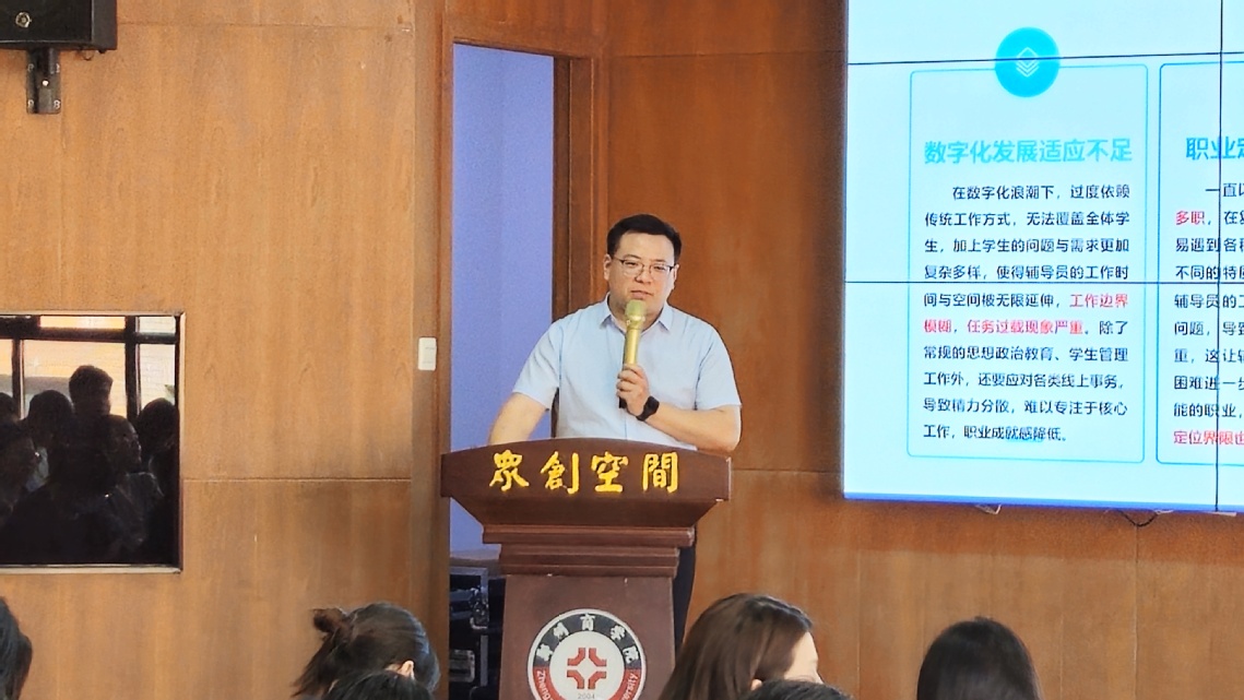 为进一步提升辅导员队伍专业化、职业化建设水平,4月24 日,我校在学生事务服务中心三楼路演厅开展“数字化背景下辅导员职业发展”专题培训,此次培训由会计学院党委书记刘宏涛担任主讲,各学院入职2-3年的辅导员参会。