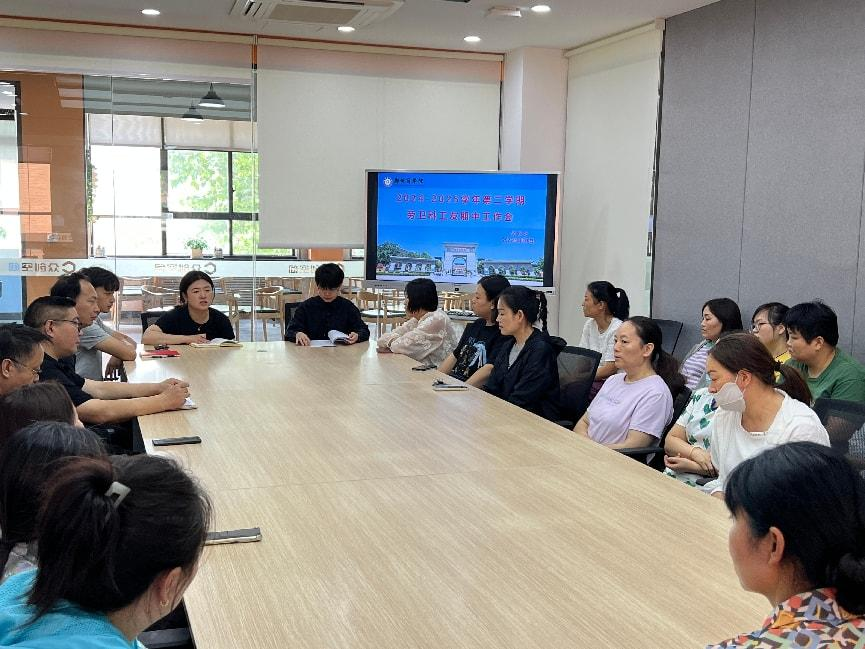 为进一步规范教学楼管理员、校园清洁工日常行为,提升全员服务意识,改进工作方法和技巧,学务处劳卫科于5月30日上午,在学生事务中心二楼会议室召开了劳卫科工友期中工作会,劳卫科全体教职工参加会议。