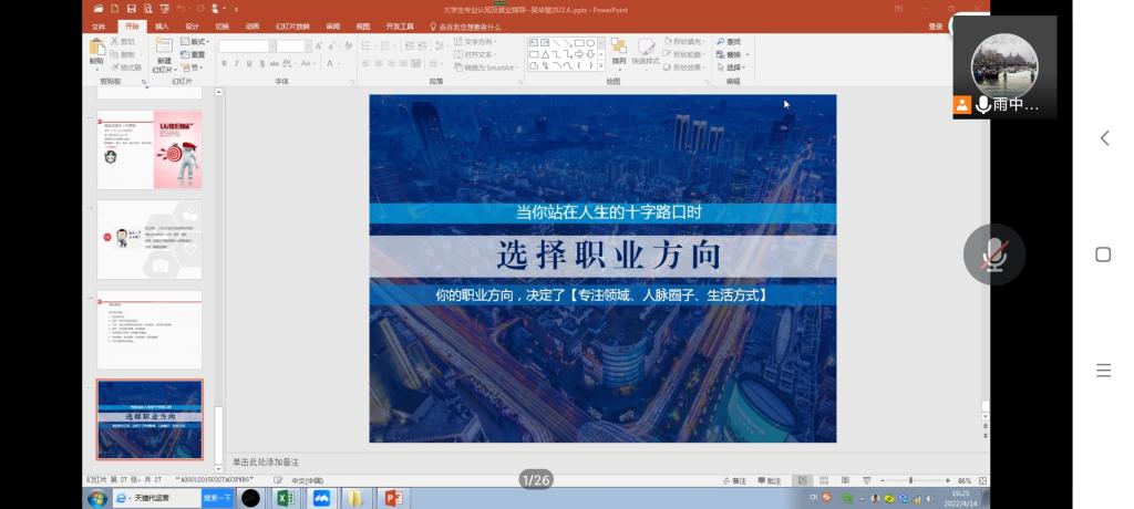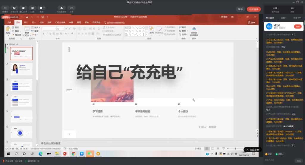4月15日晚,我校优秀毕业生胡佳欣通过钉钉直播作《给自己“充充电”》为主题的报告。