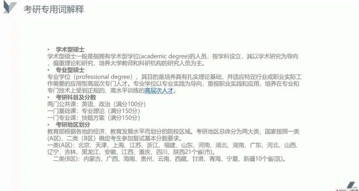 陆老师从个人和院校两个层面介绍了如何择校。一方面,同学们要根据自身的本科院校、专业水平、英语能力、获奖经历,以及个人的发展意愿来选择考研目标院校。另一方面,也要考虑到目标院校的层次水平、地理位置、是否具有博士点等问题。此外,陆老师还介绍了学硕和专硕的区别、考研的地区划分和艺术设计类考研的科目和分数设置等学生关心的问题。