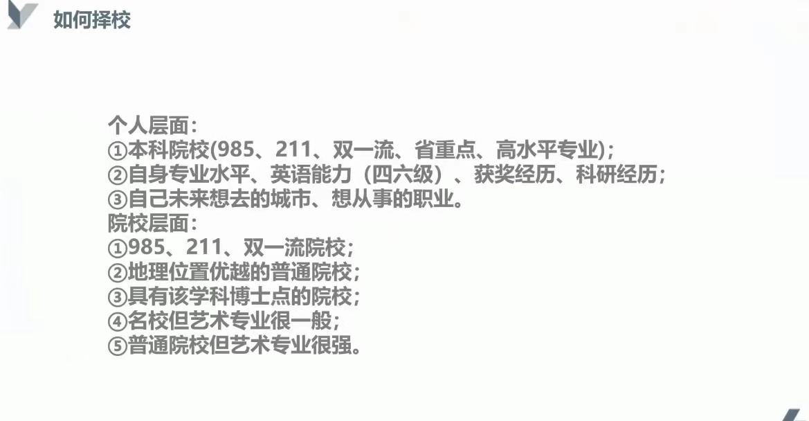陆老师从个人和院校两个层面介绍了如何择校。一方面,同学们要根据自身的本科院校、专业水平、英语能力、获奖经历,以及个人的发展意愿来选择考研目标院校。另一方面,也要考虑到目标院校的层次水平、地理位置、是否具有博士点等问题。此外,陆老师还介绍了学硕和专硕的区别、考研的地区划分和艺术设计类考研的科目和分数设置等学生关心的问题。