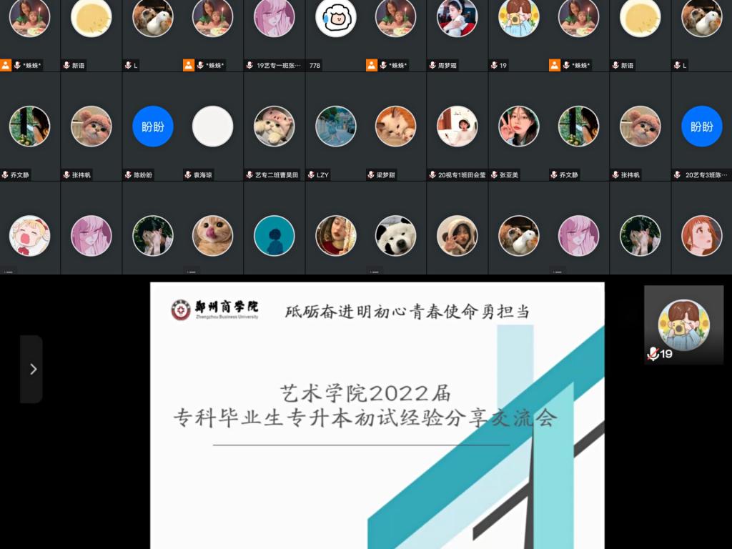 经验互分享,交流促成长。在2022届学生即将毕业之际,艺术学院组织“砥砺奋进明初心 青春使命勇担当”优秀毕业生线上主题报告会。为帮助艺术学院专科学生进一步了解专升本报考的信息政策,增强专业初试的信心,激发同学们的学习热情。5月13日晚上19:00,我院面向全体20级专科学生通过腾讯会议召开了“2022届专科毕业生专升本初试经验分享会”。