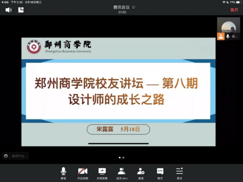 本期主讲人邀请到是艺术学院2019届环境设计专业省级优秀毕业生—宋露露同学,该生在校期间曾担任艺术学院团总支副书记,现任金辉煌装饰工程有限公司设计师兼店长。艺术学院环境设计专业相关学生参加了此次线上报告会。