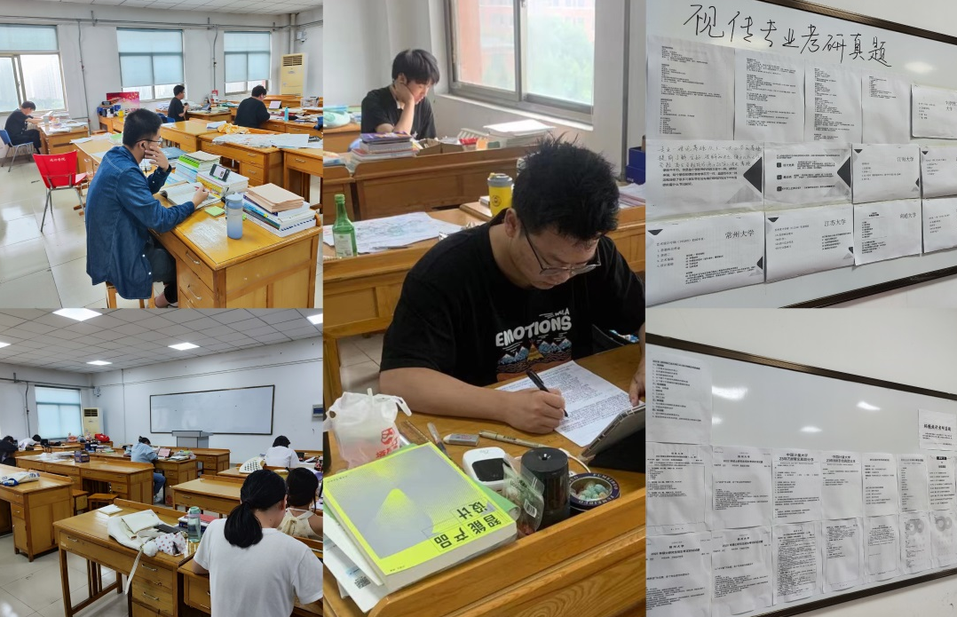 在暑期,有的学生留校复习、有的学生在家复习,留校生每天早早来到考研自习室看书、刷题,除了吃饭睡觉,所有的时间都在自习室中,考研组老师在考研自习室粘贴了多所院校考研真题,供学生参考学习,营造良好学习氛围。