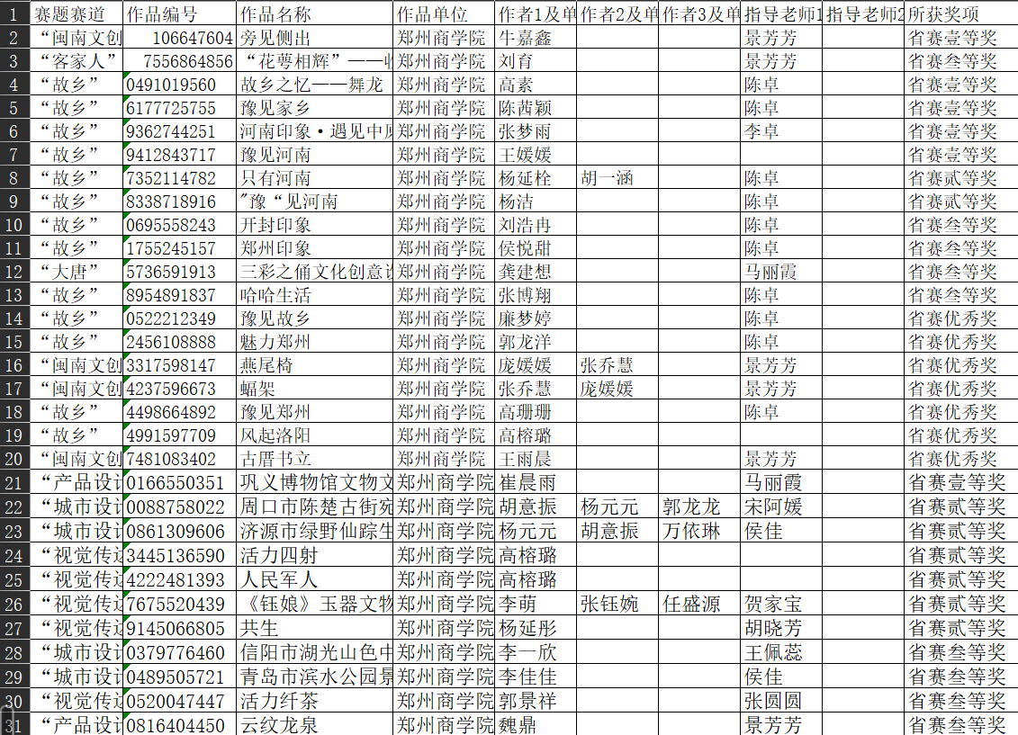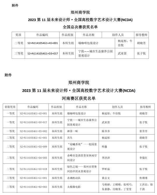 未来设计师·全国高校数字艺术设计大赛(NCDA)是由工信部人才交流中心主办,教育部中国高等教育学会认定,15个省教育厅发文立项,“学习强国”学习平台支持的国家级大学生竞赛。我校艺术学院学生在第11届未来设计师·全国高校数字艺术设计大赛河南省赛中获一等奖3项,二等奖4项,三等奖9项。并且在全国总决赛中获得一等奖1项,三等奖1项。