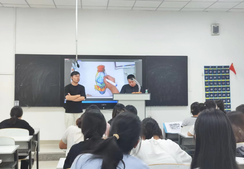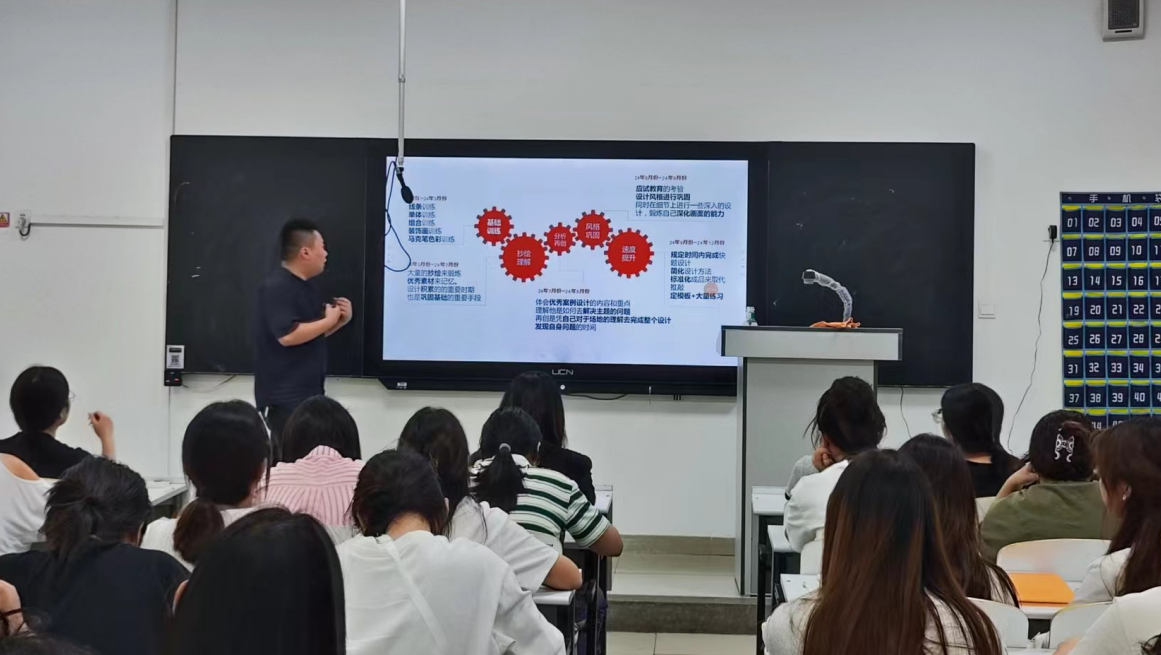 会上还邀请了综合快题设计经验丰富的老师,给同学们讲解了手绘快题的分类,一张优秀快题是如何构成的。他分别从基础训练、抄绘理解、分析再创、风格巩固、速度提升这几个方面进行分享,并进行现场手绘技法展示。使同学们对综合快题设计有更直观的认识。