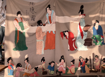 本案创作题材选自中国古代艺术。画中鲜明的色彩对比与宜家ANNAKAJSA安娜卡萨窗帘的米黄色相融合,全画采用了连环画构图以及中国传统三点透视法各个部分之间衔接生动自然。画面赋色艳丽而不冗杂,鲜明而不单调,人物妆容精致,给人以细腻的美观。是大唐繁华昌盛的重要见证。