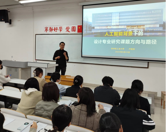 为深入推进教育教学综合改革,在人工智能背景下进一步构建设计学的应然课程体系,促进学科建设和拔尖人才培养,11月9日下午,艺术学院邀请郑州轻工业大学艺术设计学院副院长、博士生导师卢建洲教授来我校在艺术楼122教室为艺术学院师生带来了一场《人工智能背景下的设计学专业交叉趋势与人才培养路径研究》的精彩报告。报告由艺术学院院长李宪广主持,艺术学院师生200余人聆听了报告。