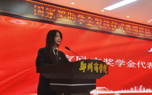 随后,由本次获得国家励志奖学金的学生代表李萌同学上台发言。她在发言中提到了党对青年大学生给予很大的关心和爱护,学院领导和老师们也对学生们进行教育和栽培,对其表示由衷的感谢,并表示定不负党和国家的殷切期望,怀揣一颗感恩的心不断奋进,努力实现自己的人生价值,用实际行动回报社会与学校。