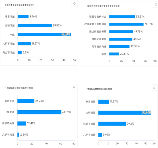 从问卷调查的最终结果中可以看出,仅有31.16%的同学对本专业的培养目标比较清晰,47.84%的同学对专业课程结构的了解程度一般,61.02%同学对本专业就业形势比较关注,还有29.2%的同学对本专业的就业方向不太清晰,此问卷调查一定程度上反映了同学们在专业认知方面存在的问题以及之后需要努力加强的方向。