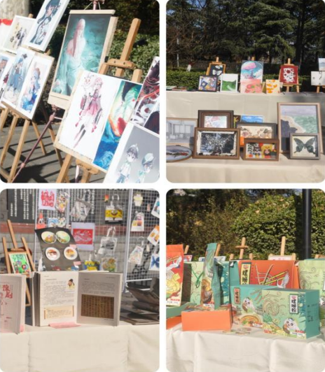 在学子风采展示环节,cosplay、漫画衍生品定制与售卖、现场书画展示吸引了大家视线。学生们通过将兴趣爱好到艺术成果的转化,从课程作品到商业品的转化,体验到了学习和创业的乐趣。