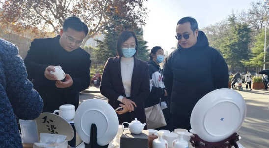 在校企联创展示模块,河洛文化手造研学基地创始人、巩义龙福白瓷手工艺品有限公司总经理韩红立先生向我们展示了由艺术学院师生设计,公司负责生产的部分商业展品,以及研学基地的掐丝珐琅、古法造纸、古法拓印、活字印刷等非遗体验项目。韩总在肯定我校师生创意设计能力的同时,也希望通过此次活动平台,更好地向大家展示河洛文化流域特有的文化遗产项目,让大家在实际操作的同时,贴近历史,参与到地方文化遗产的推广和保护中。