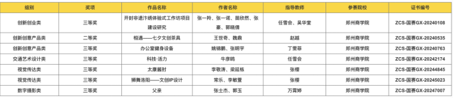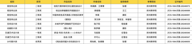 中国好创意暨全国数字艺术设计大赛是我国数字艺术设计、数字创意及数字媒体、数字技术创新领域内的一项权威赛事。该赛事规模大、参与院校多、影响广泛,并已入选教育部中国高等教育学会发布的《全国普通高校学科竞赛分析报告》。大赛的核心目标是落实国家数字创意产业的远景规划,转化高等院校的原创知识产权,深度挖掘、选拔和推广中国创意界的精英人才和优秀作品。同时,该赛事也一直在带动学科发展、推动专业建设,并已成为高校艺术创意领域的风向标。艺术学院学生在第18届中国好创意暨全国数字艺术设计大赛河南省赛中荣获省级一等奖1项、二等奖2项、三等奖5项、优秀奖1项;在全国总决赛中获得二等奖1项,三等奖6项。