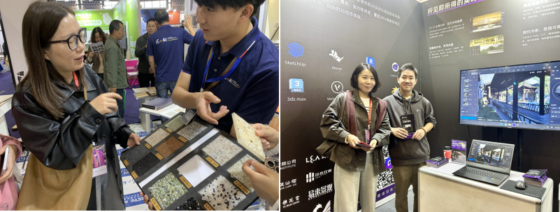 在论坛及会展活动现场,两位老师主动和设计师,以及花园设计表现软件的技术人员、材料企业人员、设备开发等人员进行了深入的沟通和交流。进而在花园设计的文化理念、可持续发展,以及花园设计的表现软件、花园设计用材、花园维护设备等层面,全方位、多角度的解锁了花园行业的新趋势。同时也了解到了花园力量的强大,花园设计的无限边界以及更多行业发展的新方向,不仅扩展了专业边界、拓宽了学术视野、也丰富和积累了教学素材。