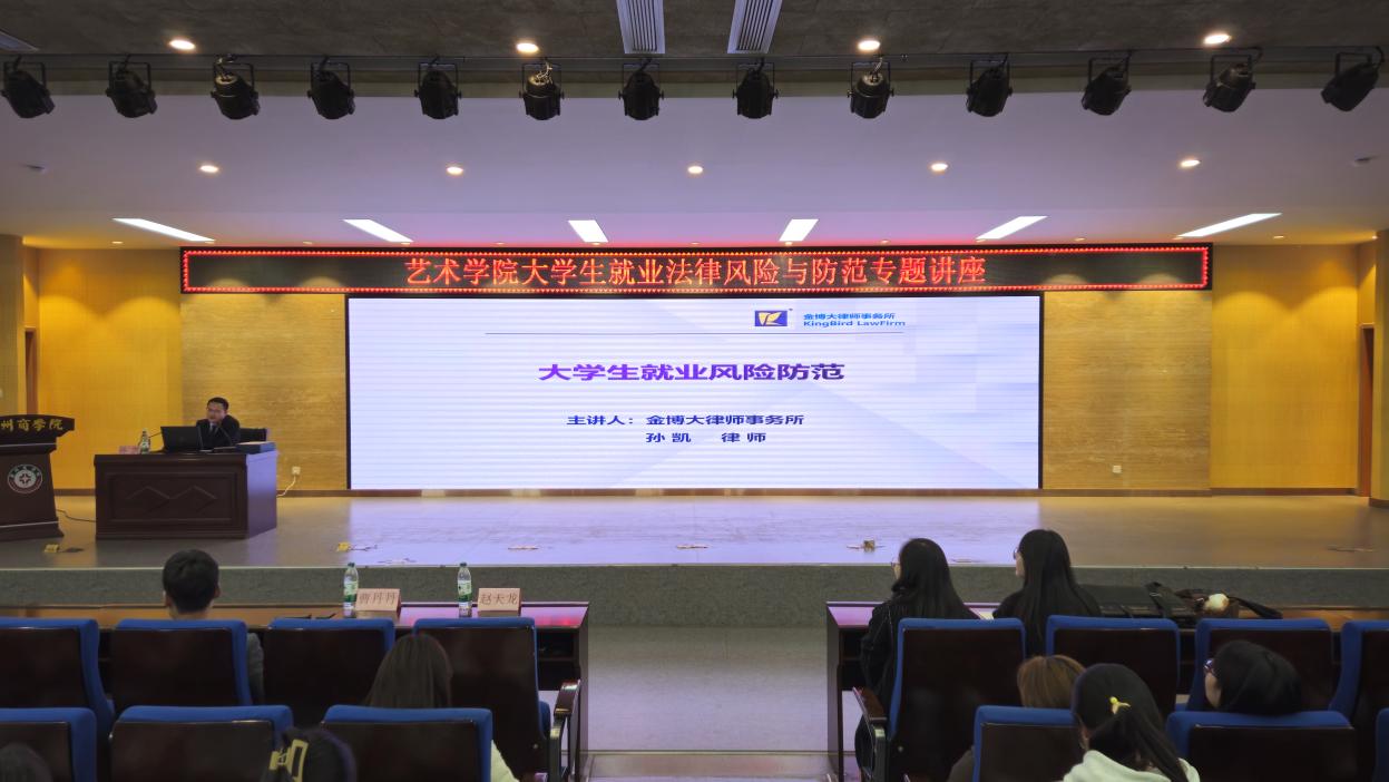 为了增强艺术学院学生的法律意识,提升就业过程中的自我保护能力,艺术学院特举办了一场以“大学生就业法律风险与防范”为主题的专题讲座。本次讲座荣幸地邀请了知名律师孙凯。由艺术学院就业专员赵天龙老师主持。
