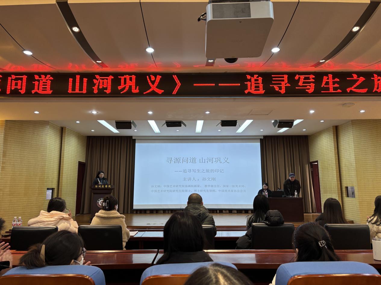 2024年12月27日上午,中国艺术研究院油画院画家孙文刚教授莅临我校图书馆五楼报告厅作《寻源问道 山河巩义》——追寻写生之旅的印记学术讲座。艺术学院无课教师及学生代表参加此次讲座,讲座由艺术学院副院长徐千淇主持。