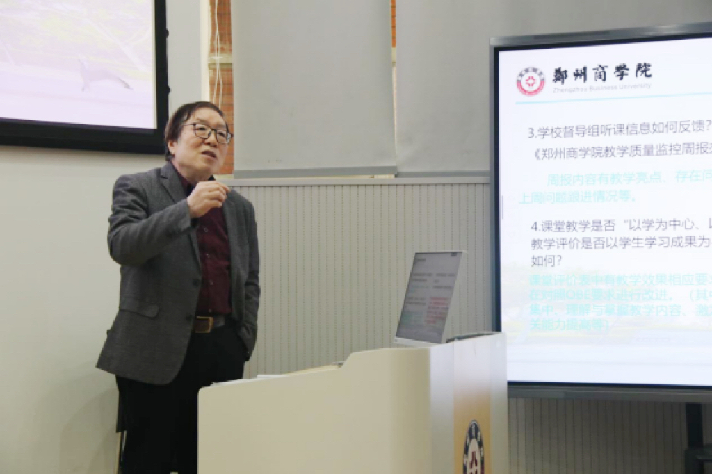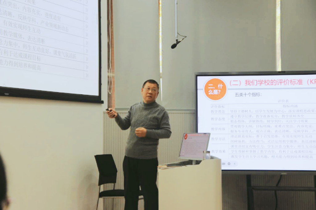 在专题培训环节,首先,校级督导杨尚军教授作《基于OBE理念的课堂教学质量评价》专题报告,他从“为何评、评什么、怎么评”三个维度系统展开,深入阐释了新时代对教师提出的新期望,并详细解读了我校课堂教学质量的五类十项评价指标。杨教授重点围绕“反向设计、正向实施”的OBE教学逻辑,通过丰富的一线听课案例,生动展示了如何在课程设计中融入思政元素、分层分类教学、学科前沿内容及信息技术手段,实现“以学生为中心”的教学转型。他还分享了“教学风险清单”管理与PDCA闭环质量改进机制,引导督导教师既会“督”更善“导”,共同推动五自质量文化建设。